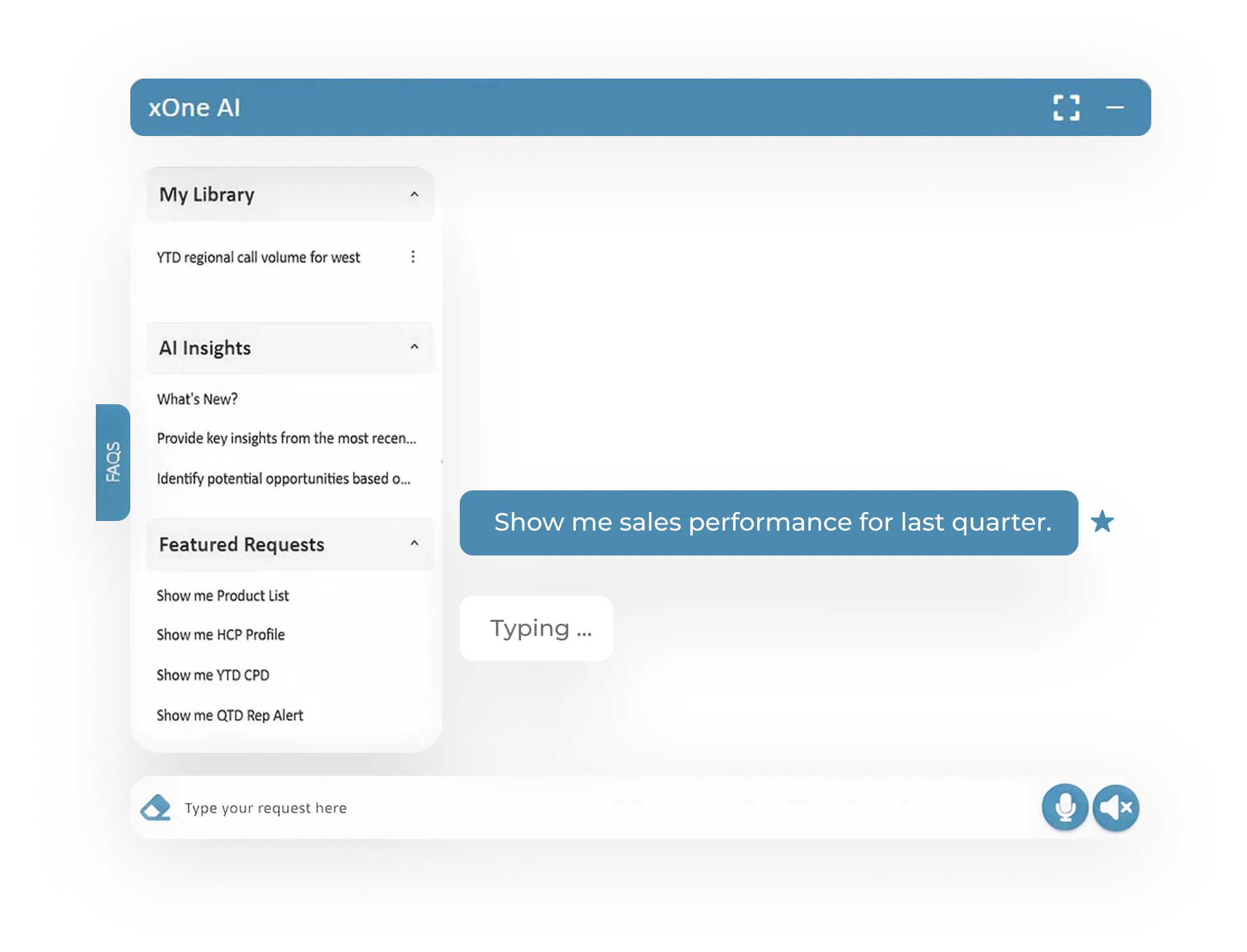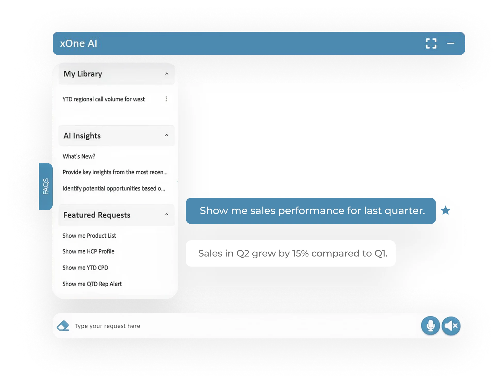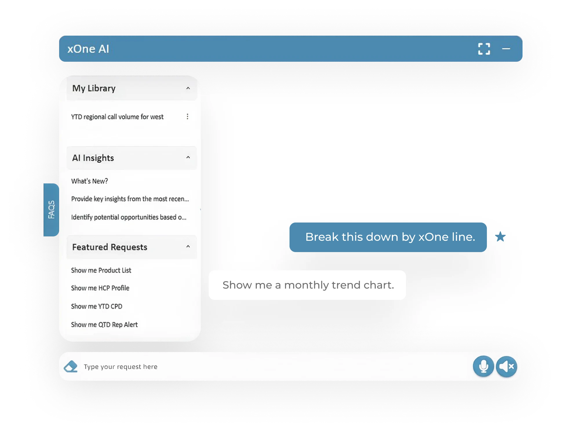 Finally, the days of painstakingly hunting through charts and menus to compile data are over. Only have 5 minutes before detailing a new HCP? Simply ask questions and find what you’re looking for in seconds.